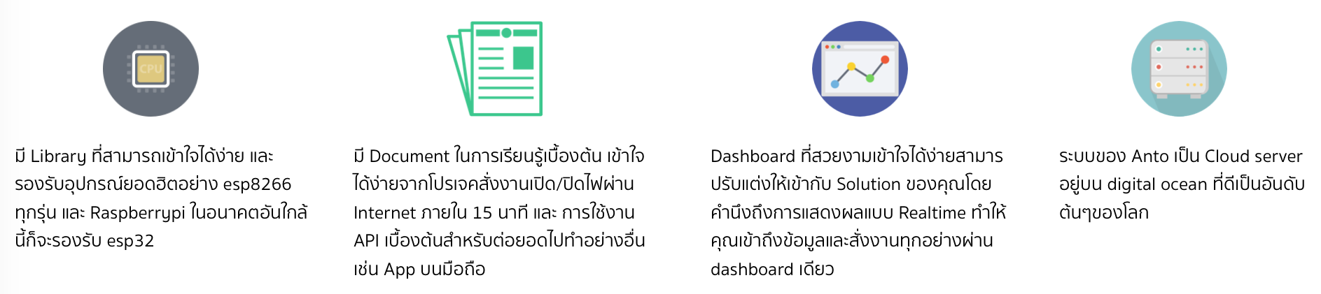 Anto คือสื่อกลางในการสื่อสารระหว่าง Hardware เข้าสู่ Internet และมีเครื่องมือที่ช่วยให้คุณสร้างสรรค์นวัตกรรมทางด้าน Internet of Things ได้ง่ายขึ้นครับ
